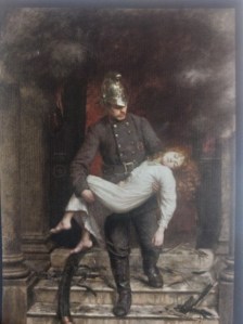 Over the years there has been much speculation regarding “Saved” and the house in the background of the painting. The house was believed to have been Winchester House, a large Victorian house in Southwark Bridge Road, which subsequently formed part and home of the LFB recruit training centre. The house was originally built for Captain Eyre Massey Shaw who was then Chief Fire Officer of the Metropolitan Fire Brigade which later became the LFB. It was also believed it depicted Captain Shaw and girl he was carrying was his daughter.